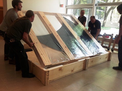 Each of the glass bells is wrapped in Tyvek and surrounded with custom-cut foam collars that fit snugly around the piece.