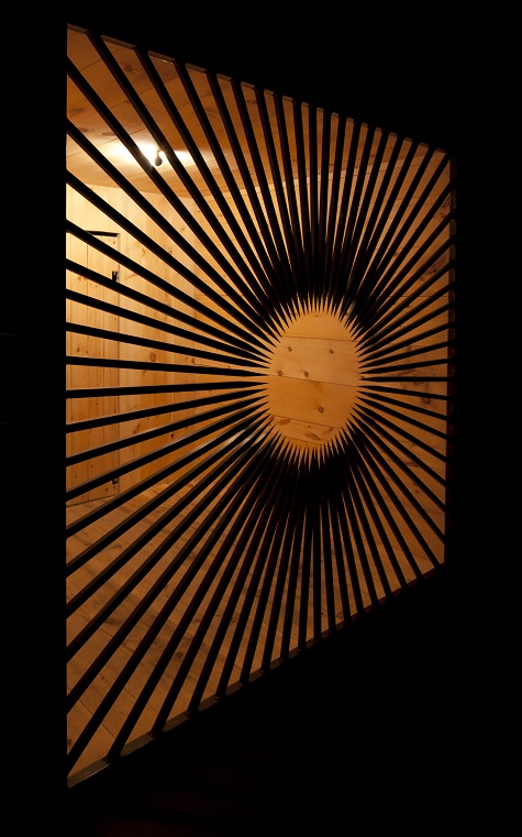 Jim Hodges, the dark gate, 2008, wood, steel, electric light, perfume, paint, and flooring, Private Collection