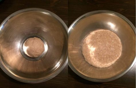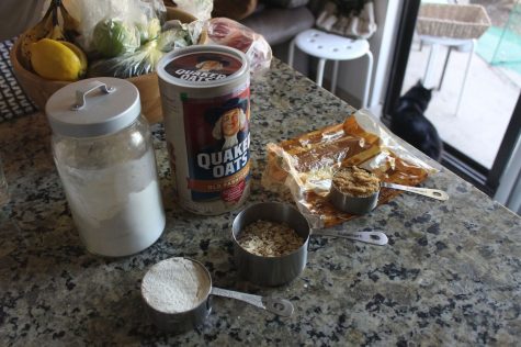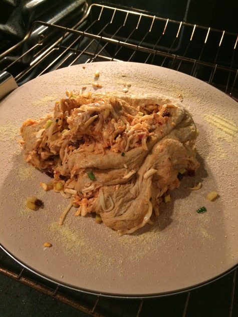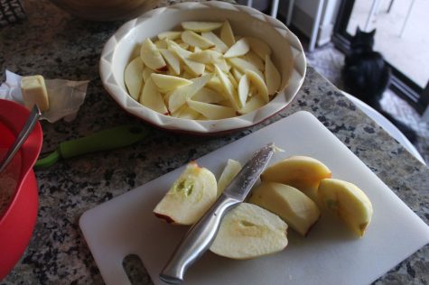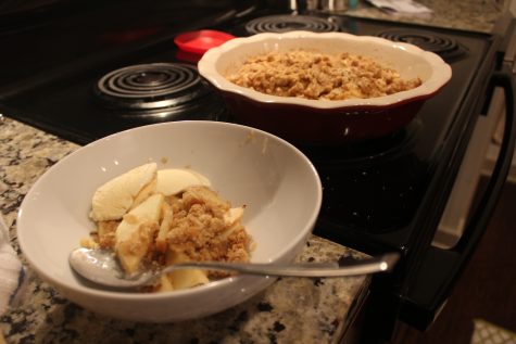 After all that cutting you throw the apples in the buttered pie pan. You melt the “cube of butter”, that is all it said in the recipe, so I used my best judgment. You melt it and mix that into the dry ingredients and then scoop it evenly onto the apples. I covered the pie pan with foil and baked it for 15 minutes then removed the foil and baked it for half an hour. It smelled amazing while it baked, 10 out of 10 for smell alone.