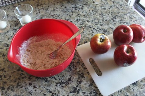 You combine all the dry ingredients together in a bowl, easy enough. And then I went to work peeling the 4 gala apples. The recipe called for sweet or tart apples. I honestly do not know what the best apple is for baking, but gala apples are usually pretty sweet, so I chose them! After peeling the apples I cut them into quarters and pared them. To be honest, I think I may have cut them a little thinner than I should, but they were all uniform and isn’t that what really matters in the end? I’m going to tell myself, yes.
