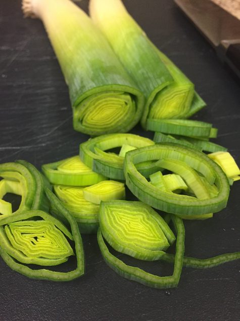First you chop the trifecta of the onion family. It’s important to spend a sold 5 minutes admiring and photographing the geometric shape and bright green color of the leeks.