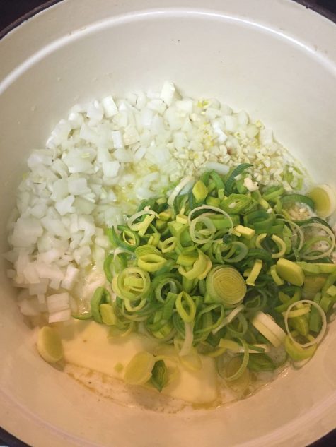In a heavy saucepan, melt an entire stick of butter, the onion, lots of garlic, and leeks and cook until soft and starting to caramelize.