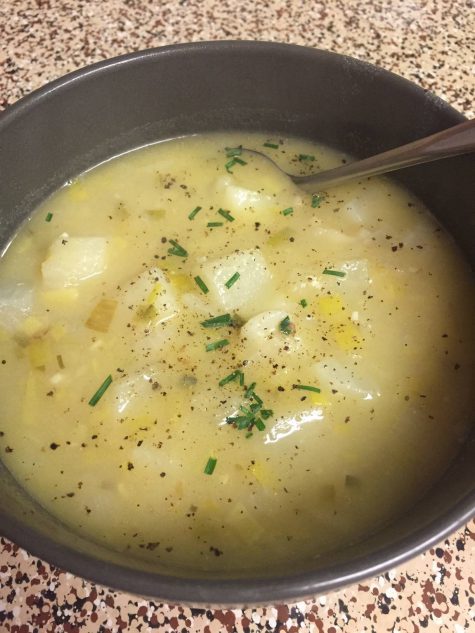 I garnished with some homegrown chives and more pepper (and maybe another splash or two of wine). I liked the soup just fine, but it needed more than just potatoes and onions.