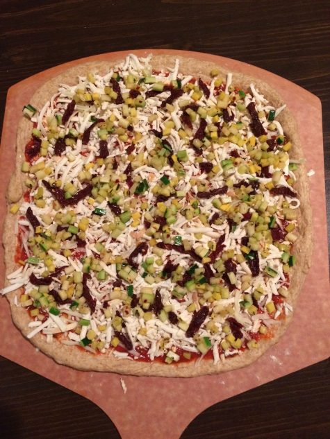 After preparing all my ingredients – shredding the smoked mozzarella and cooking the vegetables – I assembled my pizza on the pizza sheet.