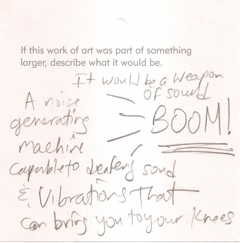 The Rocket Ship is a communal artwork created by visitors during our 9×9 C3 Artistic Encounters program last Saturday. What I love about the Rocket Ship, which looks like something from a Michel Gondry movie or a cousin of a Claes Oldenberg soft sculpture, is that it is a realization of visitor interpretations of a work of art.