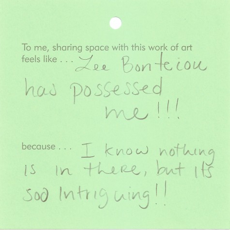 Last weekend in the Center for Creative Connections, we launched our new 9×9 Programing, specifically our third consecutive program called Giant Constructions. The program was based on Bontecou’s Untitled (35), currently found in our gallery and, I must admit, one of my favorites in the space!