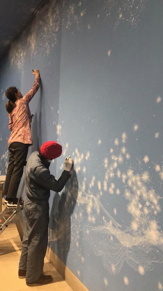 “Learning Sandra’s simple drawing vocabulary of dots and lines, which we deployed in the cavernous Concourse in the form of stars, bridges, mountains, and clouds, created a link to an ancient human past of painting cave walls, tombs, temples, canyons, and shelters with an extended family that speaks a common language of art.” —Tino Ward