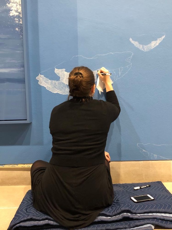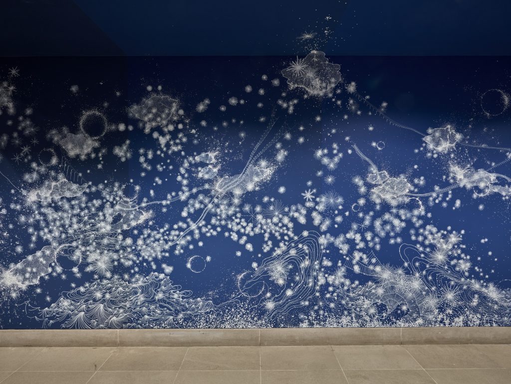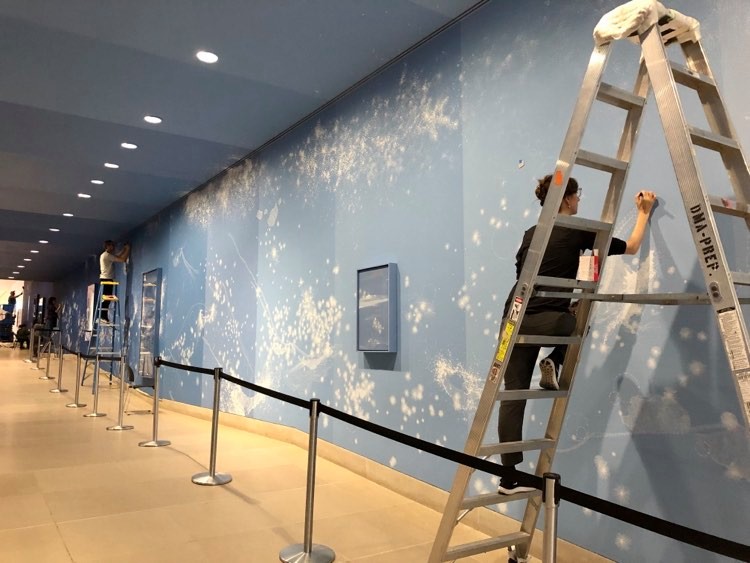 In fall 2019, Sandra Cinto’s large-scale mural Landscape of a Lifetime was brought to life in the Museum’s Concourse by the artist, along with the help of some DMA staff and a team of artist assistants from around Dallas. The team spent roughly three weeks working on the 153-foot mural, which features 24 shades of blue shifting from night to day, intricate pen drawings of celestial elements such as stars and clouds, and low-level audio of crashing waves, rustling leaves, birds, and crickets.
