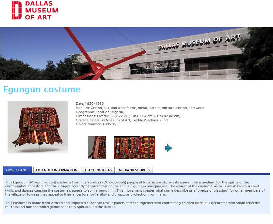I reveal to you the new template for online teaching materials and the future of online resources for teachers and students at the Dallas Museum of Art. Each work of art will have its own set of information, clearly organized according to tabs. The “First Glance” tab provides introductory information about the object, similar to the information found on a label in the galleries. It may serve as the hook to pull you further into an exploration of the artwork. The “Extended Information” tab provides paragraphs of topical information that reveal more about the object. For example, the Egungun costume information includes paragraphs about Death and Religion, Materials, and African Masquerades. This text has been culled from new curatorial scholarship and existing interpretive resources. A teacher will also find contextual images in this section.