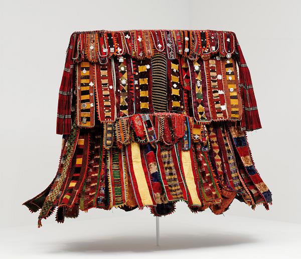 Egungun costume; 1920 - 1950; Yoruba peoples, Nigeria; cotton, silk, and wool fabric, metal, leather, mirrors, cotton, and wood; Dallas Museum of Art, Textile Purchase Fund, 1995.35.