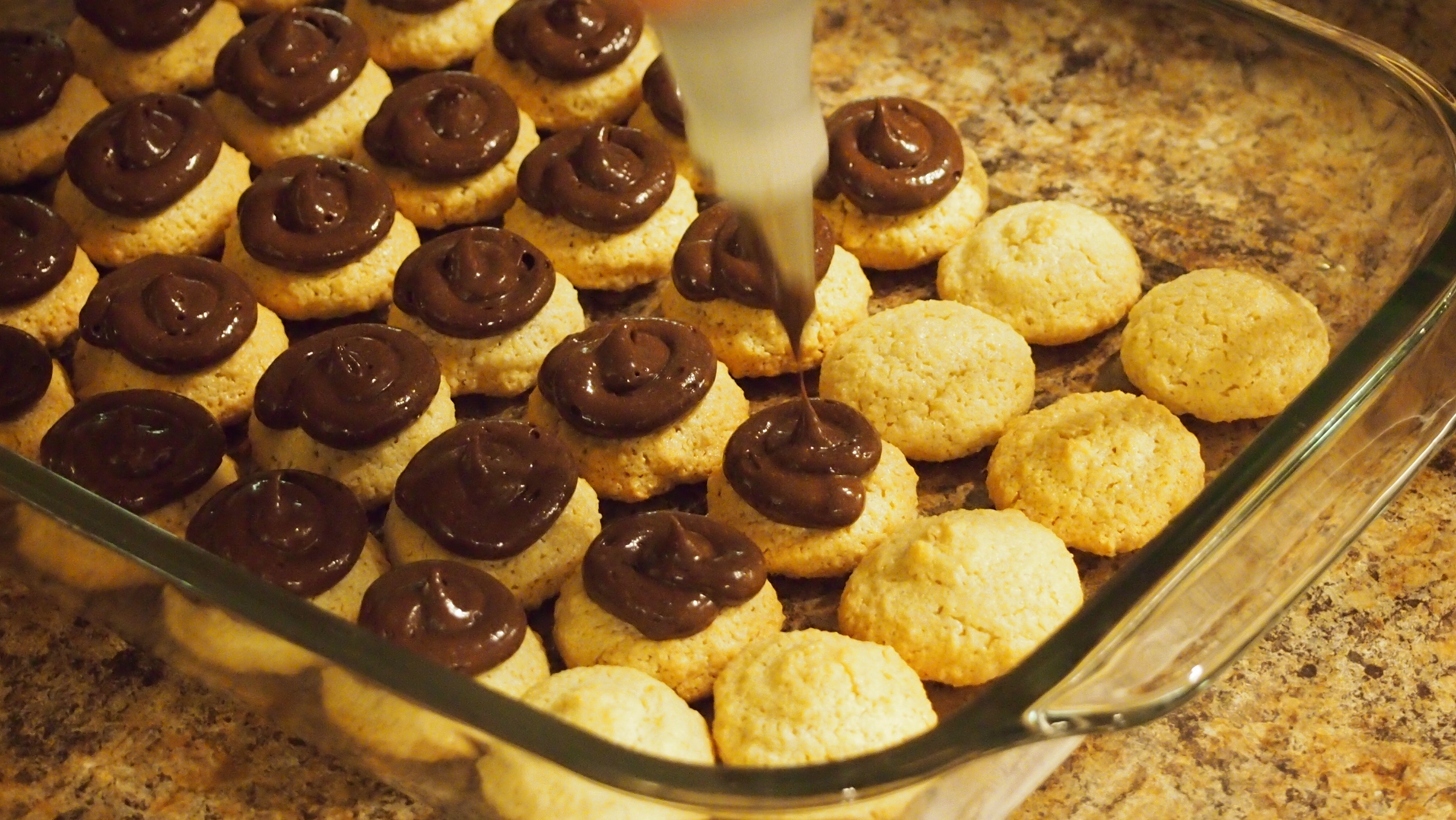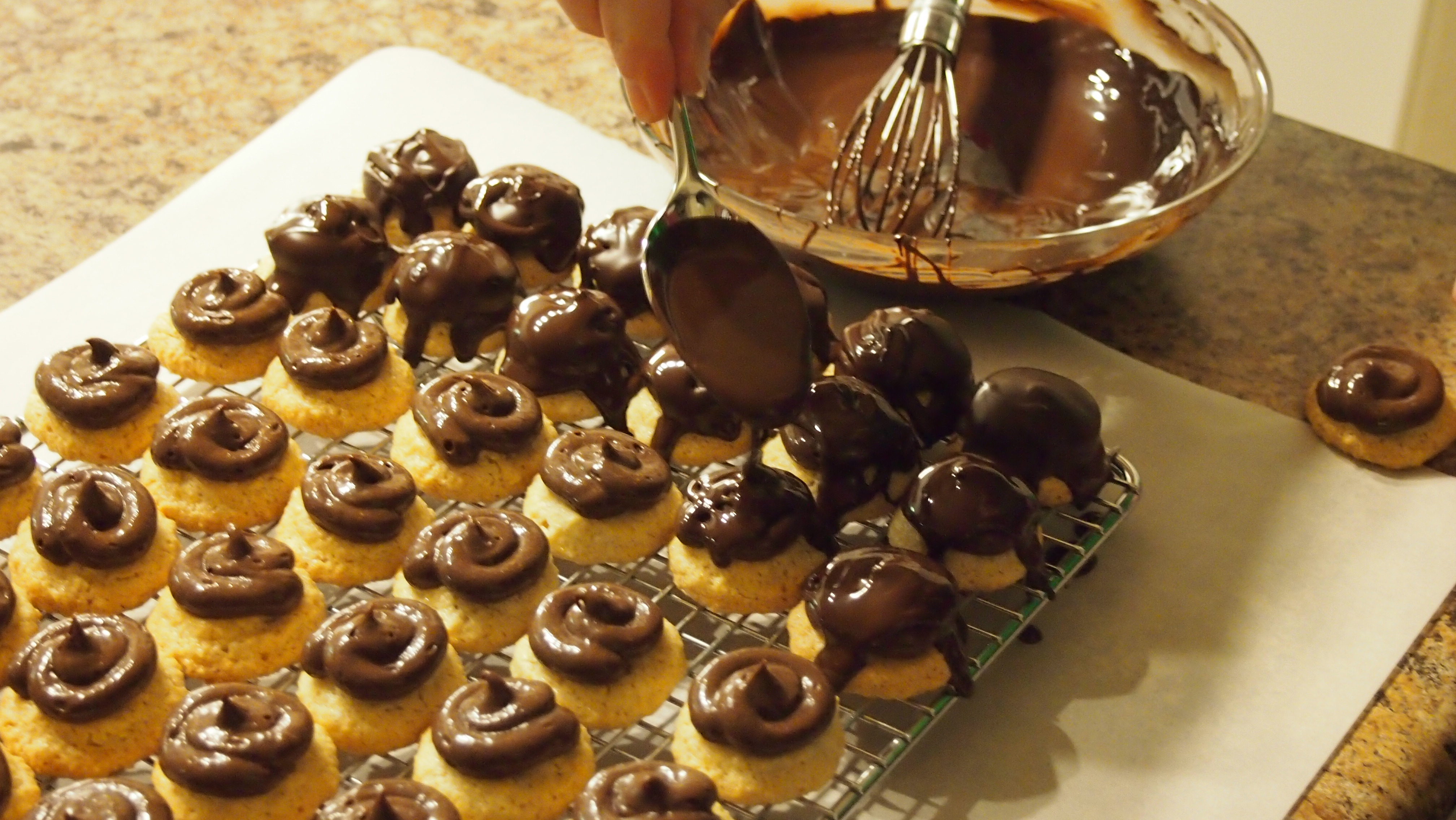 Remove cookies from freezer and place on cooling rack. Working quickly so filling doesn’t melt, spoon melted chocolate over cookies until filling is completely covered. Refrigerate finished cookies and serve chilled.
