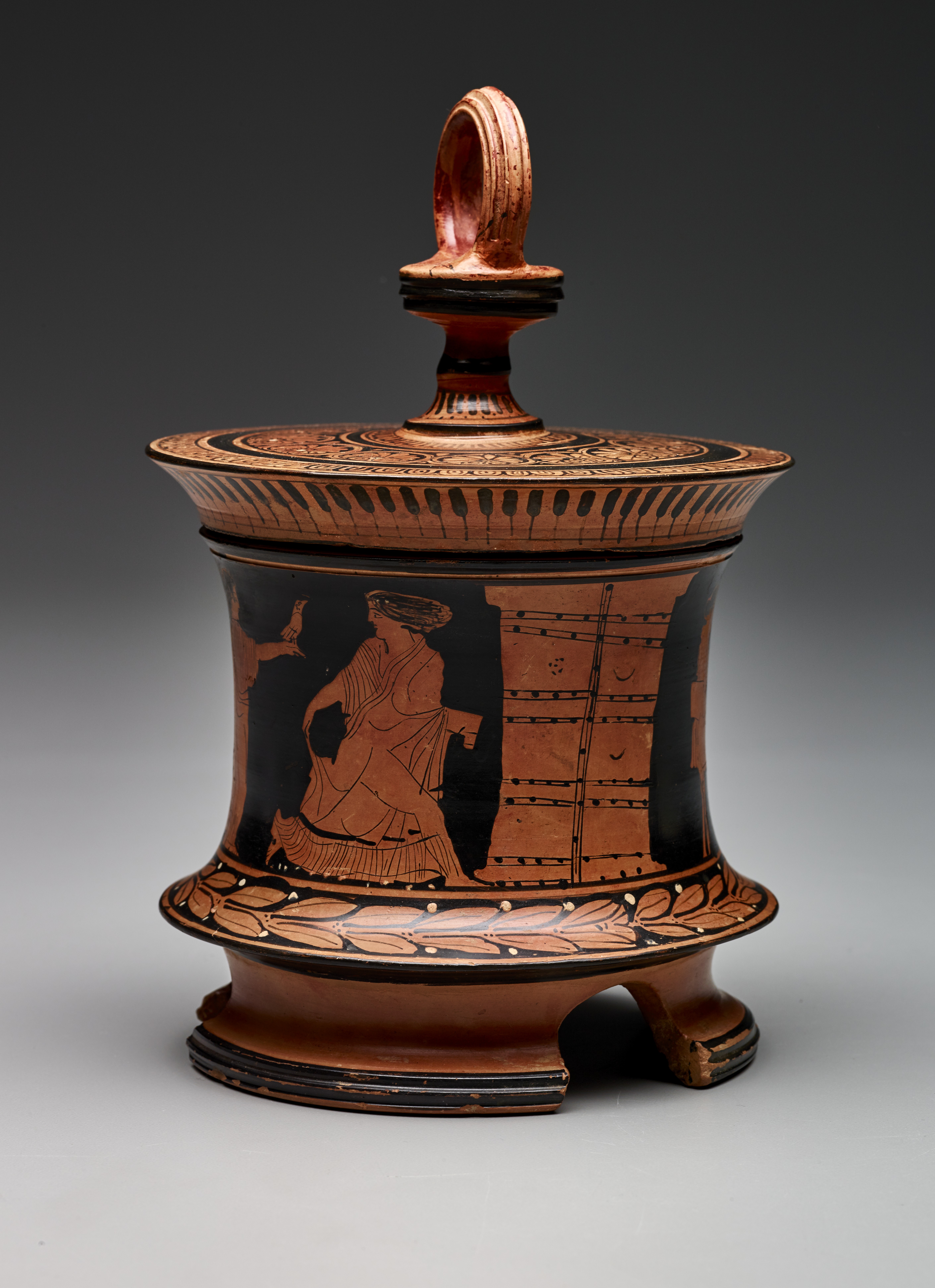 This Greek red-figure pyxis was likely given to a young woman as a wedding gift to hold her medicine, jewelry, incense, or cosmetics. The images on the outside of the pyxis depict a leisurely life at home, with closed double doors perhaps symbolizing the transition of a maiden into her new life as a wife. Even the shape of the pyxis is symbolic: the alluring lidded vessels that concealed hidden items were often a classical metaphor for women.