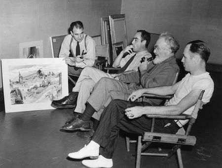Richard Foster Howard (standing) with jurors Xavier Gonzales, Donald Bear, and Frederick Browne judging the Texas section of the Greater Texas and Pan-American Exposition, 1937