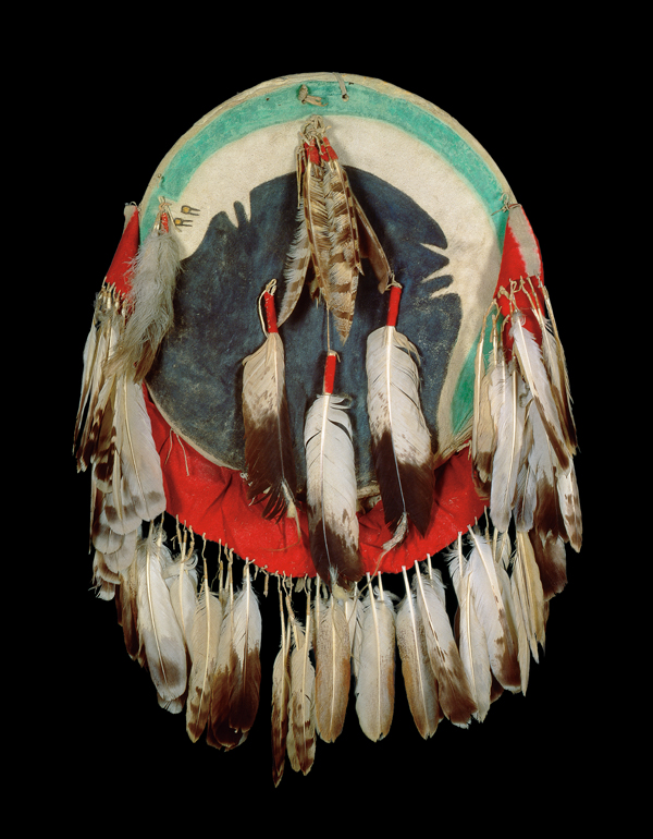 Buffalo rawhide, antelope skin, trade cloth, eagle and hawk feathers, porcupine quills