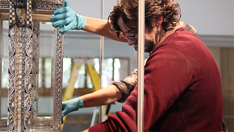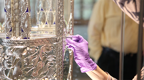 The elaborate silver vitrine (or display case) stands roughly five feet tall and is encrusted with pearls, lapis lazuli, opals, onyx, and other gemstones. Each of these materials requires different conservation approaches and solutions. The overarching goal of the treatment has been to bring the piece closer to its original 1908 appearance, as well as to stabilize a number of fragile elements. The most stunning transformation has resulted from the reduction of blackened tarnish and the removal of layers of old silver polish residue trapped within the intricate metalwork.