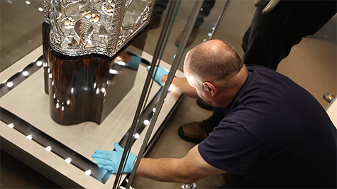Conservation treatments do not take place within a vacuum, and an exciting part of the project has been the interdepartmental collaboration between the curatorial, conservation (including myself), and collections staff at the DMA. Kevin W. Tucker, The Margot B. Perot Senior Curator of Decorative Arts and Design at the Dallas Museum of Art, and I have also been working with outside consultative experts, including silversmiths, specialty glassmakers, gemologists, research scientists, and even an ornithologist (to help identify the various birds depicted on the vitrine).