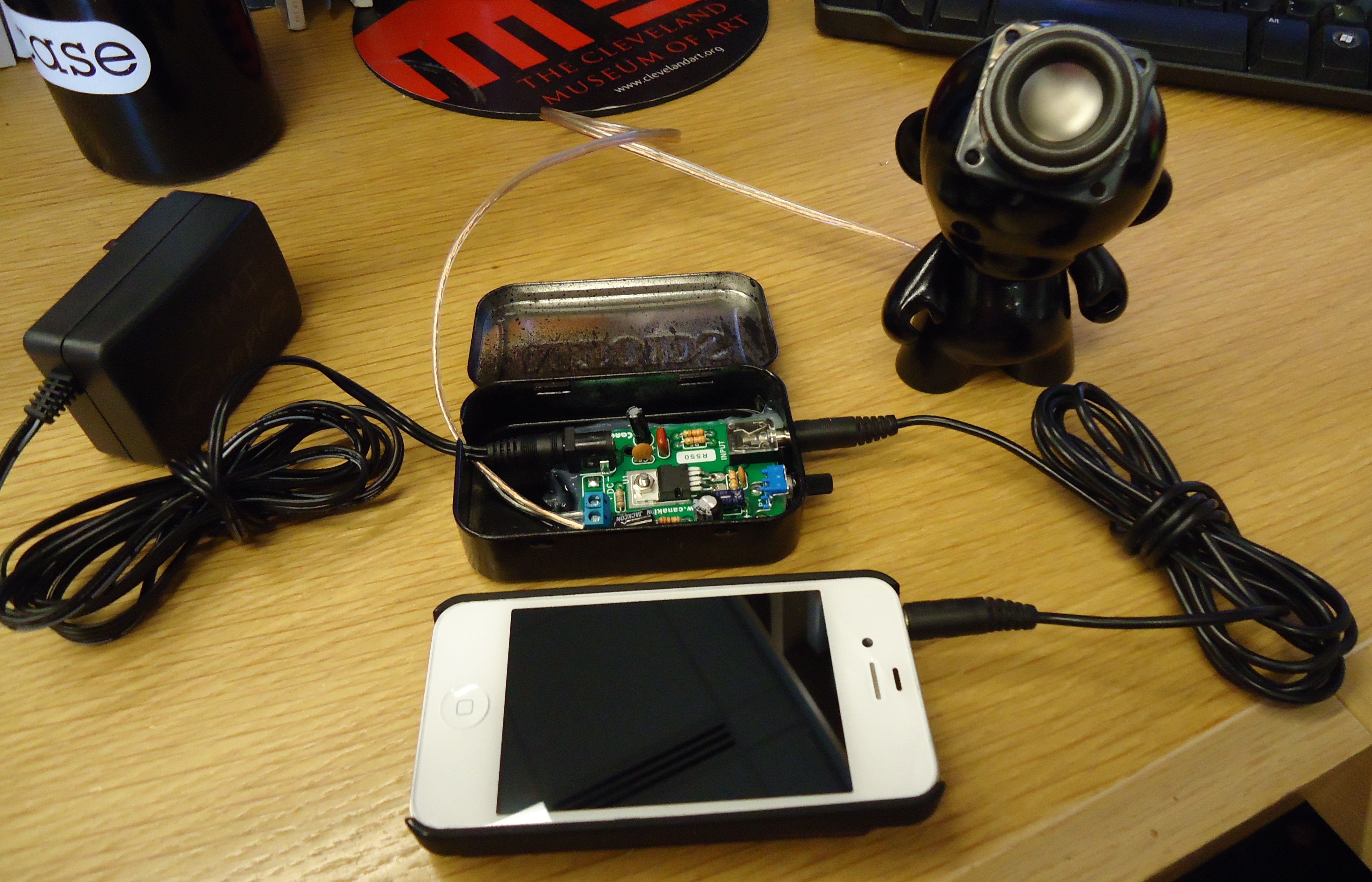 One of the coolest things about Munnys is that you can pretty much turn them into anything you want with the right materials. You can find terrific instructions on how to turn a Munny into a speaker, so I thought I’d combine that idea with an Altoids mini-amp project that I was recently working on to create a Munny mini-amp for an MP3 player or smartphone. What’s nice about it is that the amp provides a little more juice for your music than the speaker alone, and since they are separate components, you can make more Munny speakers and interchange them with the amp. You can also use the amp with most any type of MP3 gadget!