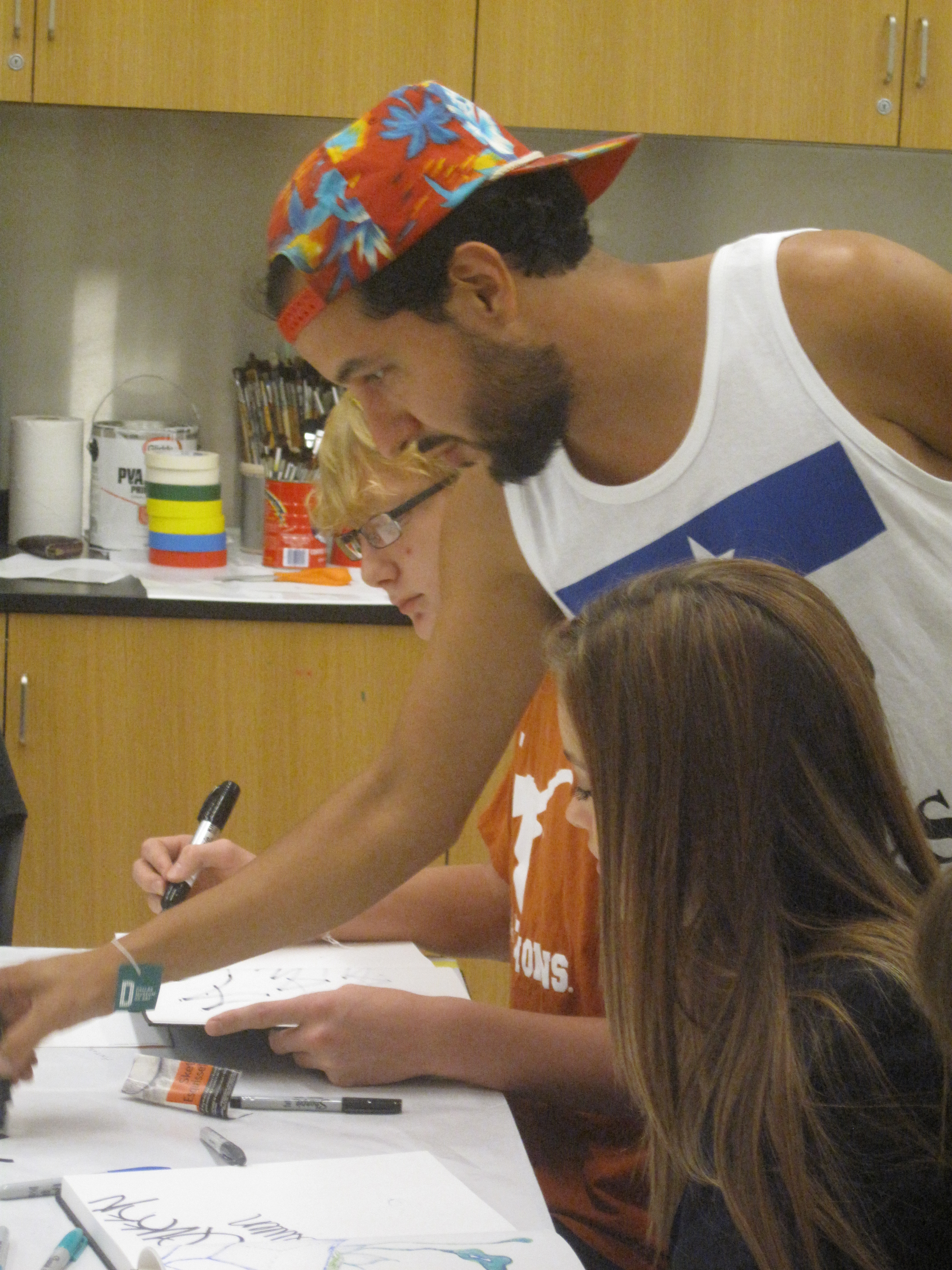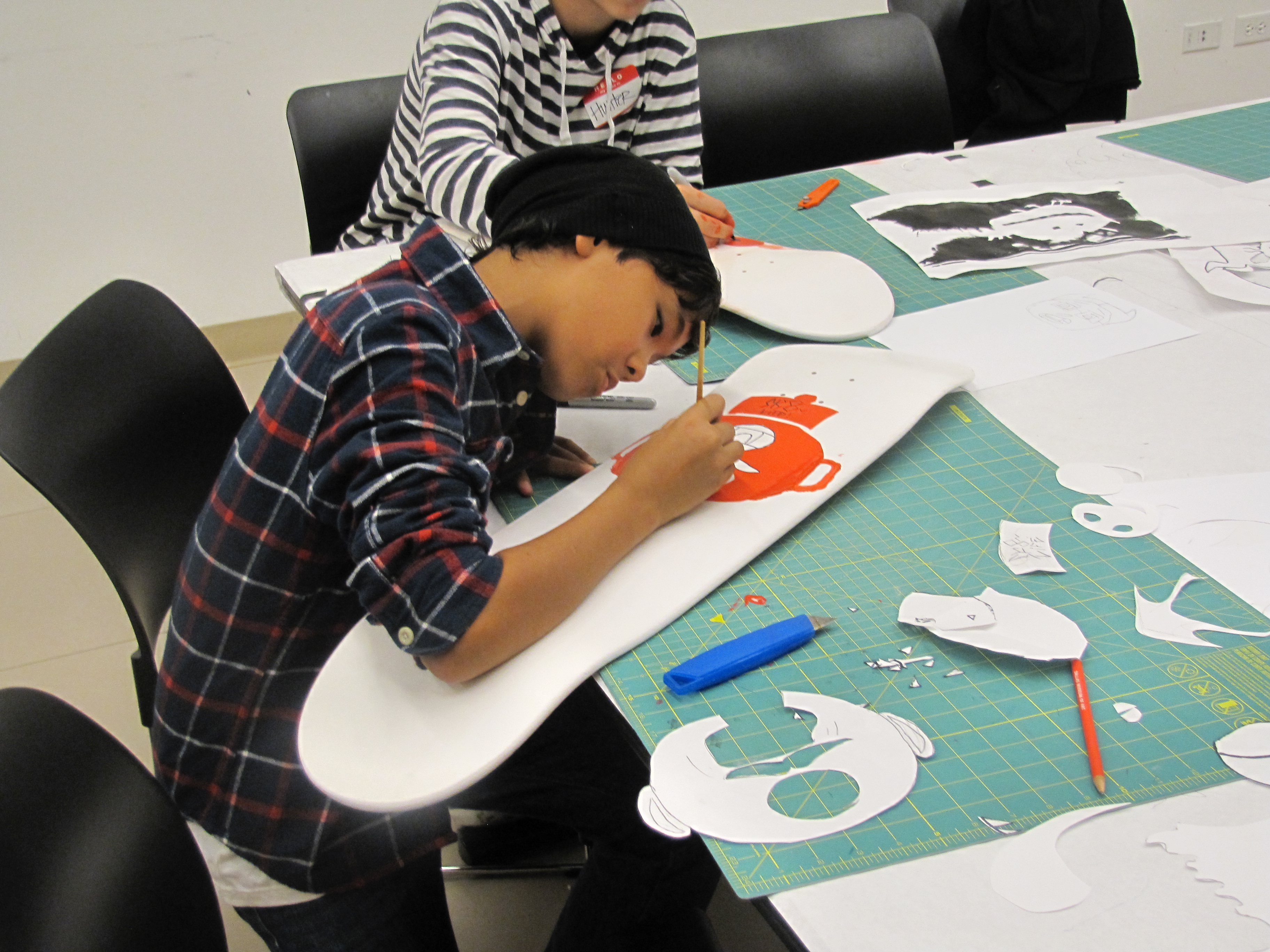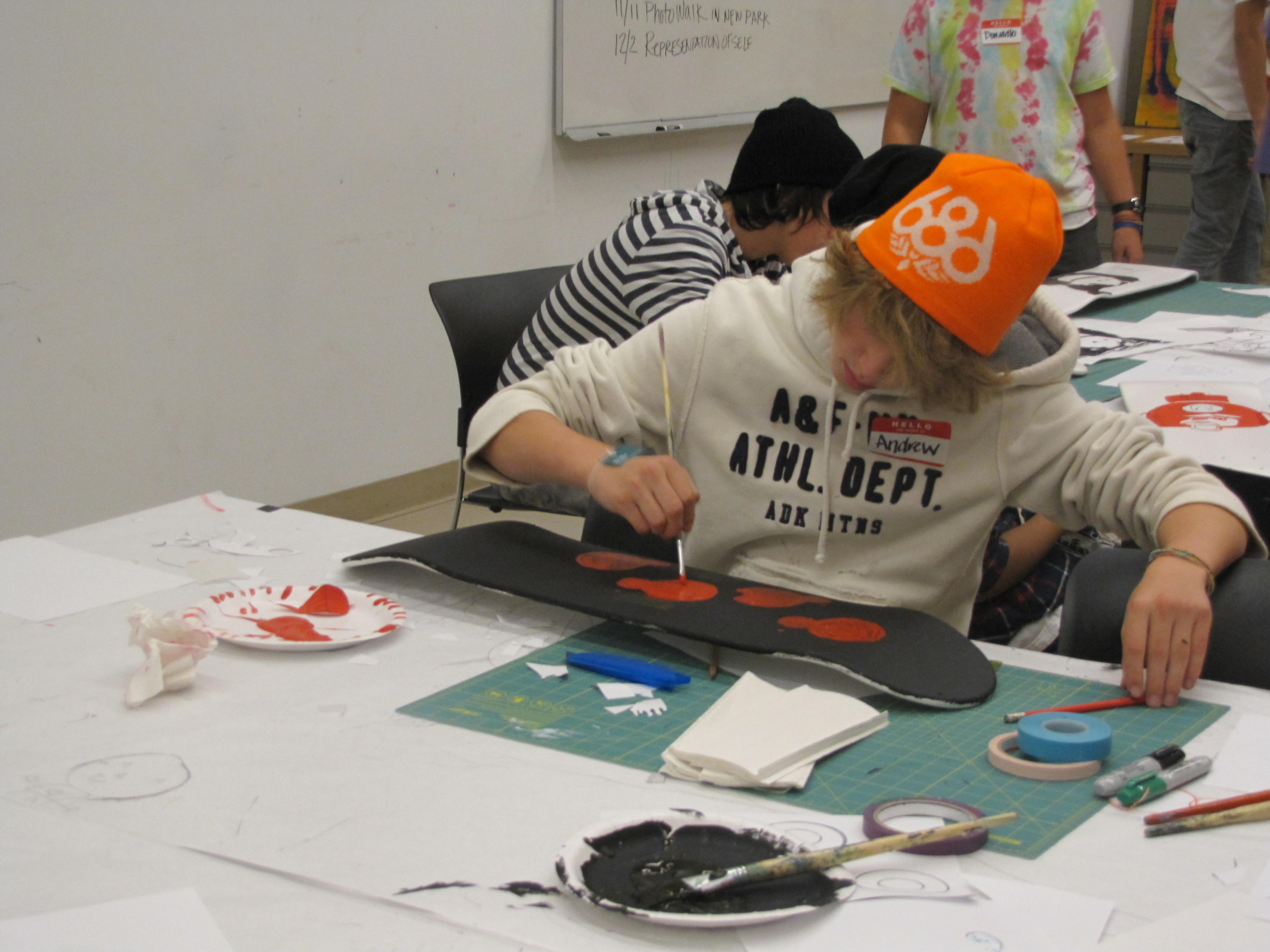 The DMA’s tween/teen program Urban Armor seeks to integrate works of art, rich group discussion, and art making with an over-arching theme of identity so that students can find relevance and practical application to their lives. This exclusive tween/teen program kicked off the new school year with an awesome class, led by art educator and artist Mark Gutting. The workshop emphasized the elements of art and principles of design in our contemporary collection in order to inspire ideas for students to use in their work—their very own skate deck! The students created custom designs, symbols, and logos and were able to screenprint these designs on the back of a skateboard. While working with him, I gained some great insight on who he is as a teacher and a student. Check out my interview with Mr. Gutting below: