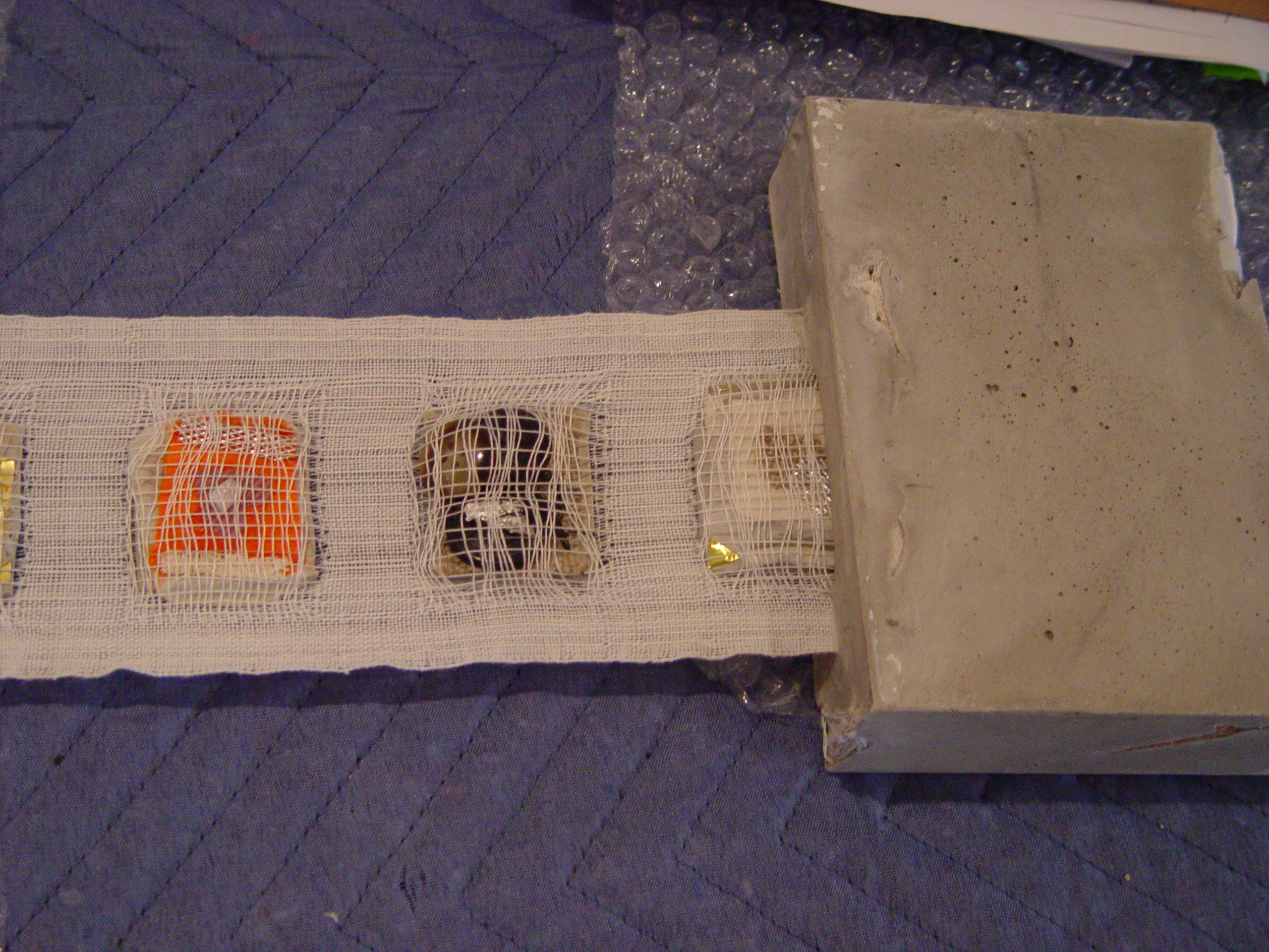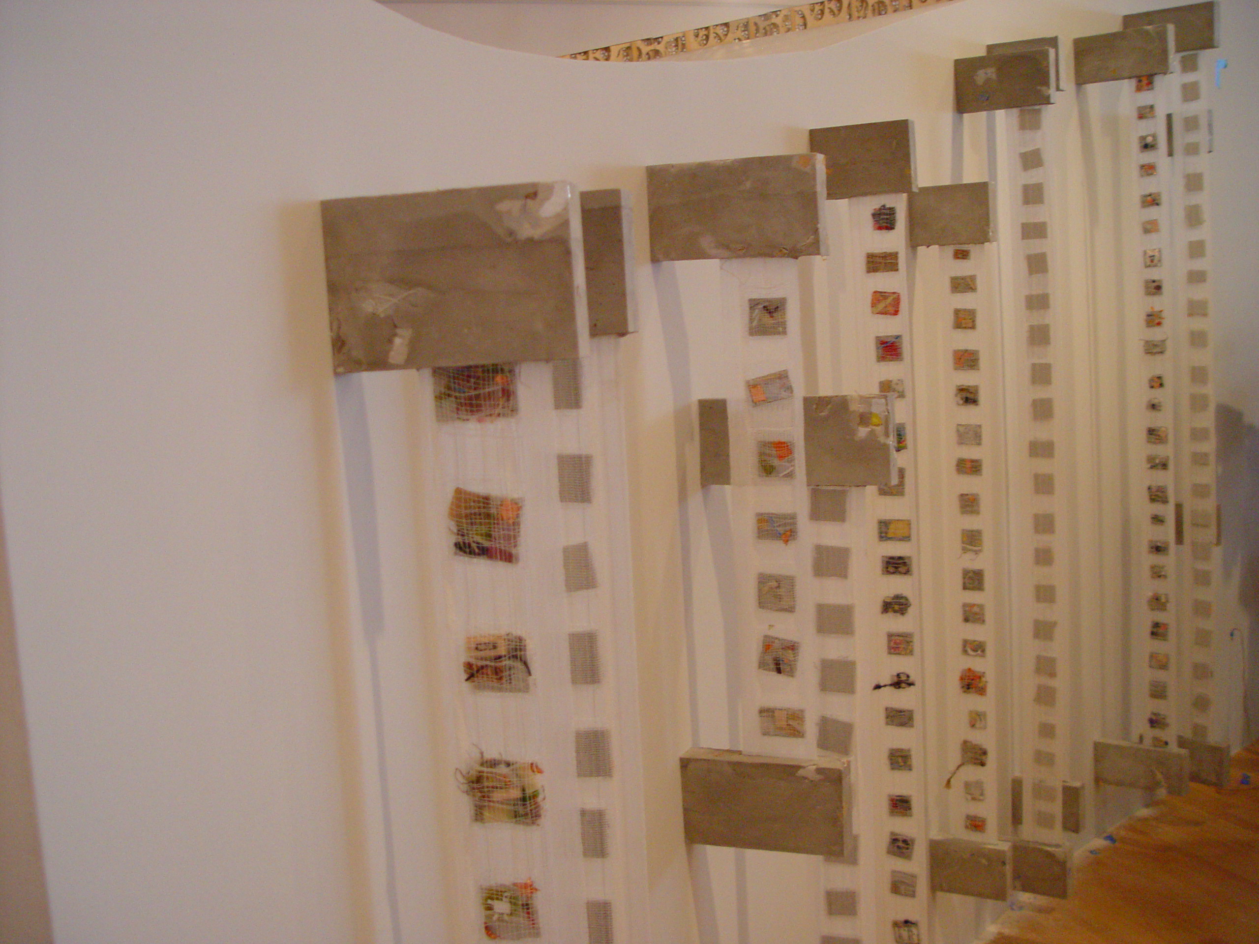 I use textile-based media; I think they have the potential for communication. My work depends on where I’m at, what I’m thinking about, what’s going on. It’s very intuitive, though I make conscious decisions on material, form, how things are installed. Part of the process is looking at where you’ve come from as an artist and where you’re going. The body of work I’m now working on is a reaction to the past three years of writing, research, and studio work. It is a comment on the evolution of my artwork. The materials I use stay the same – I started working with textile-based media and concrete five to six years ago and I love those materials. They have so much content to them and apply so well to what I want to do, formally and conceptually.