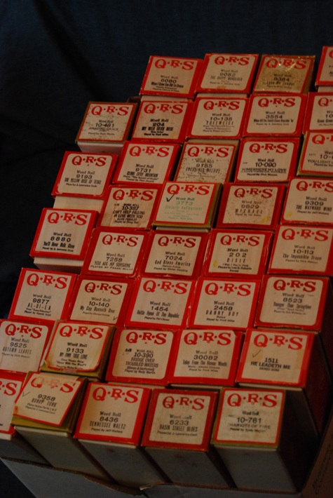 A box of music rolls for the player piano.